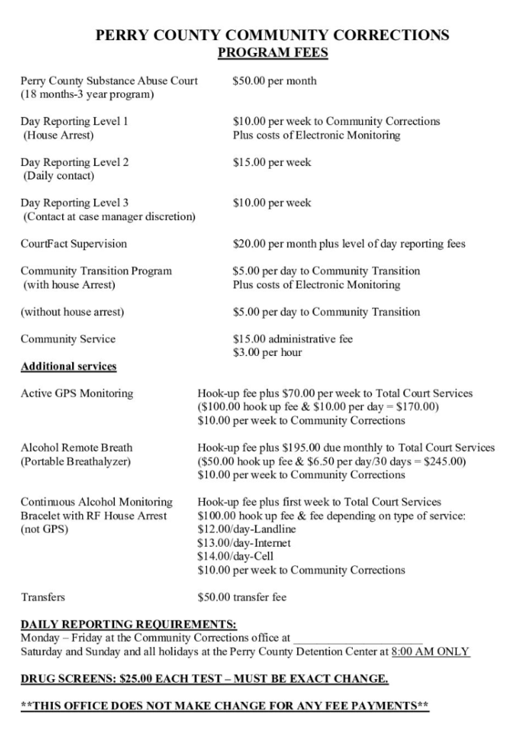 Perry County Community Corrections has created sentencing alternatives the county judicial system can use in order to keep offenders out of the local jail and the Department of Corrections. The Perry County Community Corrections uses day reporting, substance abuse court and forensic diversion, GPS electronic monitoring, and community transition program. These programs will help free up some much needed space in the county jail while providing community supervision to all participants. The programs will also allow for more frequent, random drug testing, earlier identification of problems to help prevent relapse and quicker referrals to needed services.