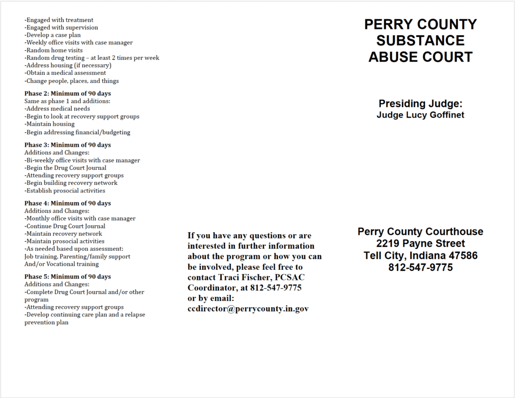 The increasing negative impact of chemical and alcohol dependence in Perry County has required the criminal justice system to explore alternative sentencing options for drug and alcohol offenders. The concept of drug court involves providing substance abusing and dependent offender’s access to long-term treatment services while under the strict supervision of the drug court. Drug courts are a non-adversarial approach to the traditional criminal justice system in that there is a team approach to working with offenders to reduce illegal drug use and criminal activity among drug court participants. Team members include the drug court judge, the prosecutor, public defender, a representative from each agency providing services to the drug court participants, coordinator, case manager, law enforcement and drug court staff. The Department of Justice, Office of Justice Programs developed the Ten Key Components of Drug Courts serve as a framework for drug court operations. The Perry County Circuit Court implements the drug court model, adhering to the Ten Key Components, in order to provide offenders in the community access to treatment services and reduce drug use and criminal activity in our community.
